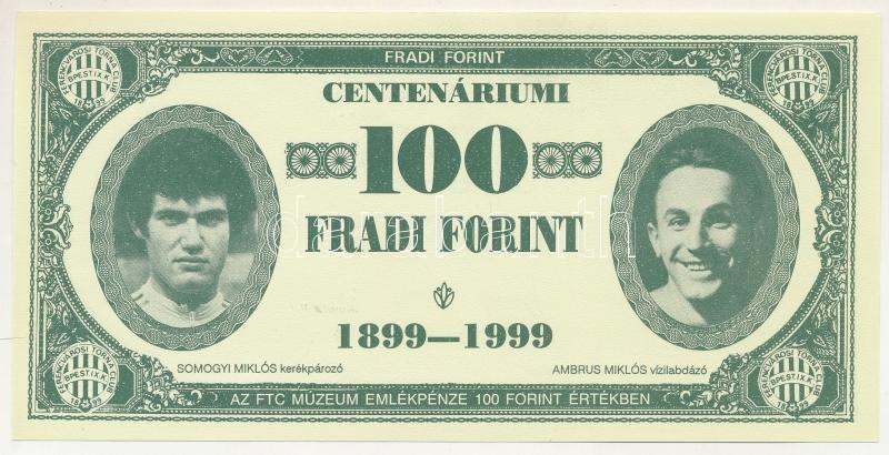 1999. 100Ft névértékű " Centenáriumi Fradi Forint" Somogyi, Ambrus, Dr. Páncsics, Rákosi fényképével
