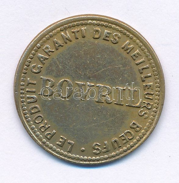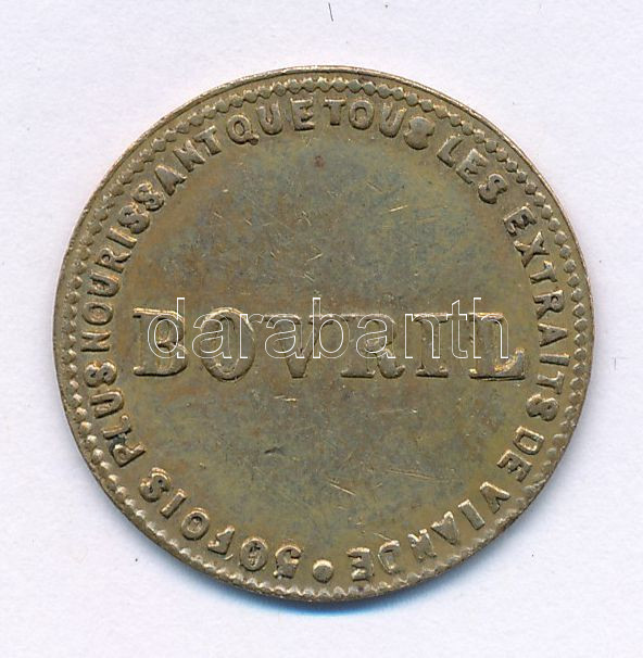Franciaország 1900 k. "Bovril" kétoldalas sárgaréz reklámzseton. A Bovril egy 1889 óta létező, ikonikus brit, sűrű, sós marhahús- és élesztőkivonat, amelyhez forró vizet, vagy ritkábban tejet kell hígítani. Levesek, húslevesek, pörköltek és zabkása ízesítőjeként használják, valamint kenhető krémként, különösen pirítóson. (21mm) T:AU