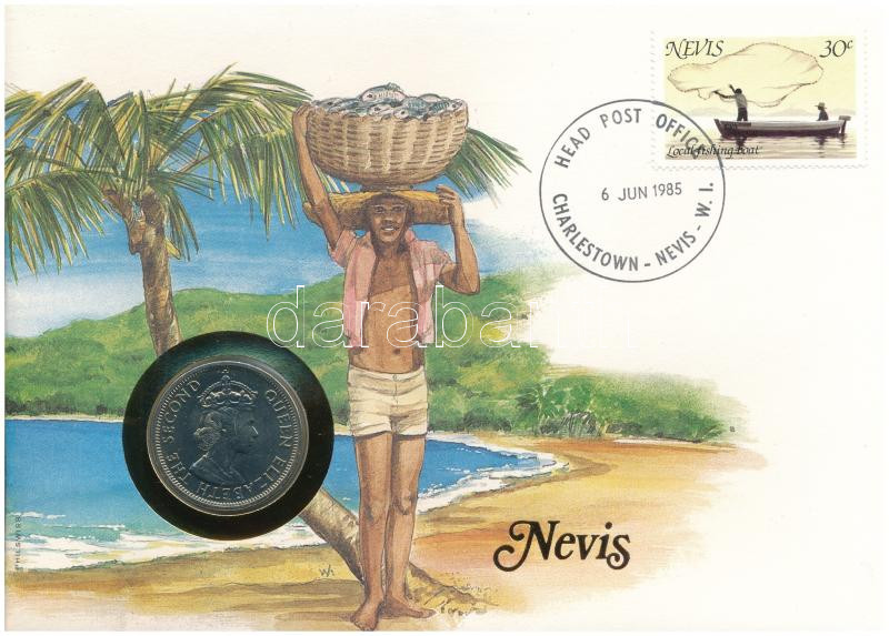 East Caribbean States / Nevis 1965. 50 Cents Cu-Ni "Elizabeth II" in envelope with stamp and cancellation, with German description C:UNC
