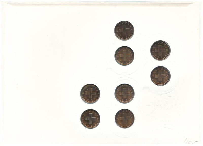 Switzerland 1984. 1 Rappen bronze (8x) in "Glücksrappen - 88.8.8. Heiligkreuz" envelope with stamp and cancellation C:UNC