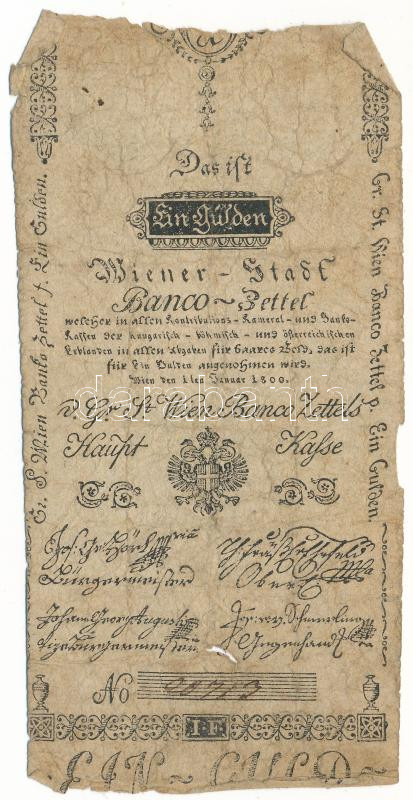 Habsburg Empire 1800. 1 Gulden "Wiener-Stadt Banco-Zettel" with handwritten serial "20313" and embossed stamp C:G