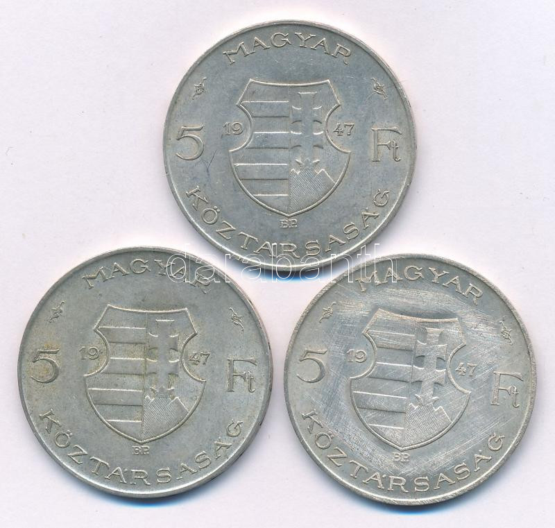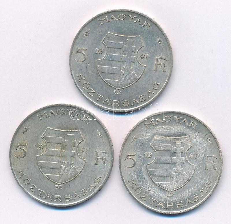 1947. 5Ft Ag "Kossuth" (3x) T:XF,VF patina, korábbi tisztításból származó felületi karcok