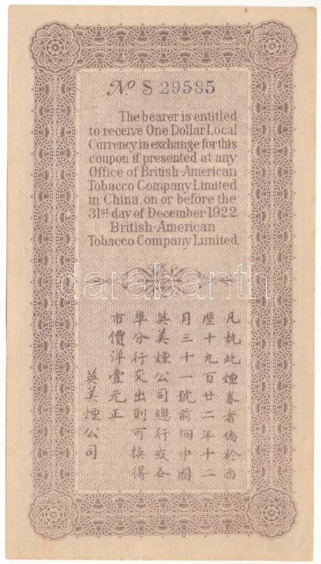 Kína 1922. 1$ "British-American Tobacco Company Ltd." T:XF hajtatlan, kis beszakadás