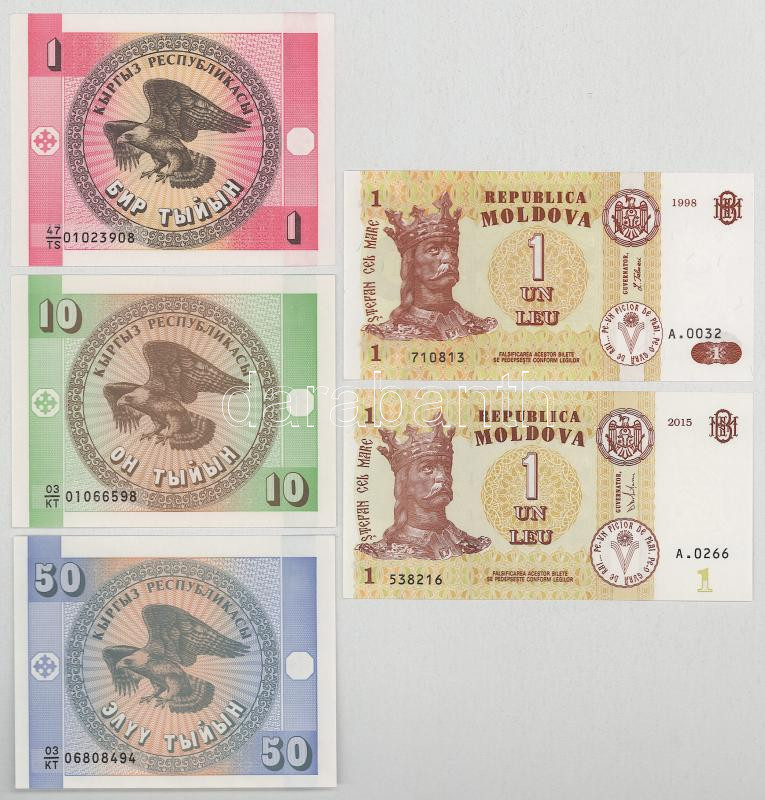 Kirgizisztán DN(1993) 1T + 10T + 50T + Moldova 1998-2015. 1L (2db) T:UNC-AU