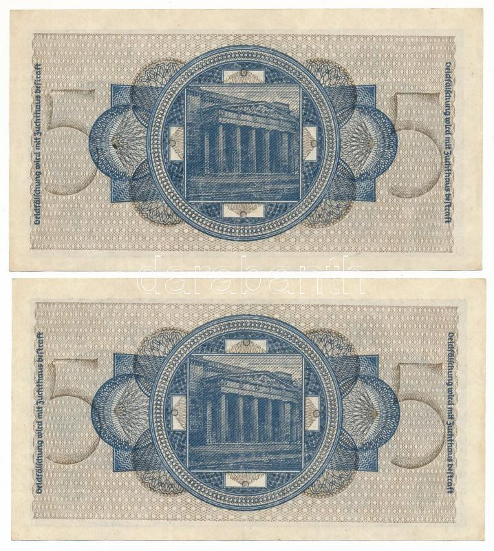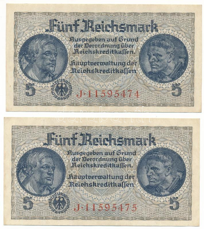 Német Harmadik Birodalom / Német megszállt területek 1940-1945. 5M (2x) sorszámkövetők "J 11595474 - J 11595775" T:XF / German Third Empire / German Occupied Territories 1940-1945. 5 Reichsmark (2x) consecutive serials "J 11595474 - J 11595775" C:XF