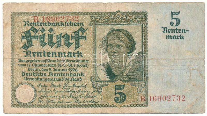 Germany / Weimar Republic 1926. 5 Rentenmark "R 16902732" C:F