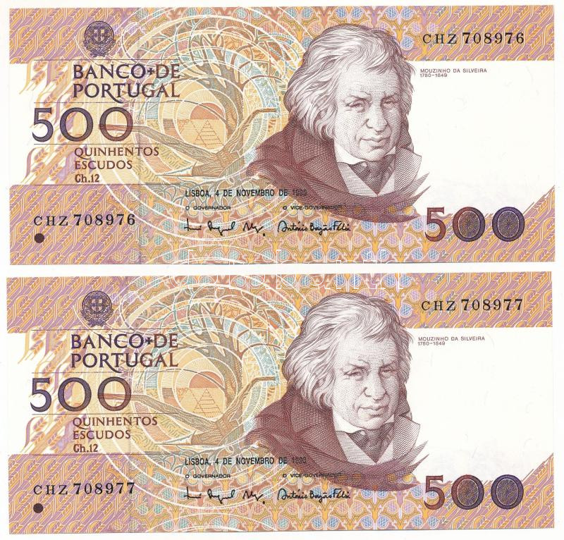 Portugal 1993. 500 Escudos (2x) consecutive serials "CHZ708976 - CHZ708977" C:XF