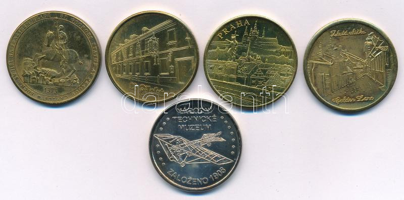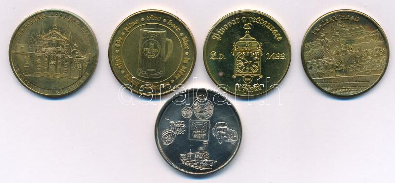Csehország DN 5xklf fém emlékérem Prága nevezetességeivel, benne: Zlatá ulička (Arany utcácska), Ů Fleku étterem (2xklf), Bazilika Svatého Jiři (Szent György Bazilika), Národní Technické Muzeum (Nemzeti Technikai Múzeum) T:UNC,AU patina
