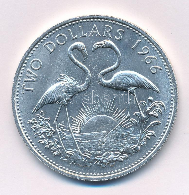 Bahamas 1966. 2 Dollars Ag "Elizabeth II / Flamingos" C:AU