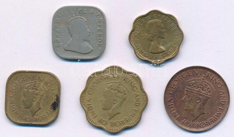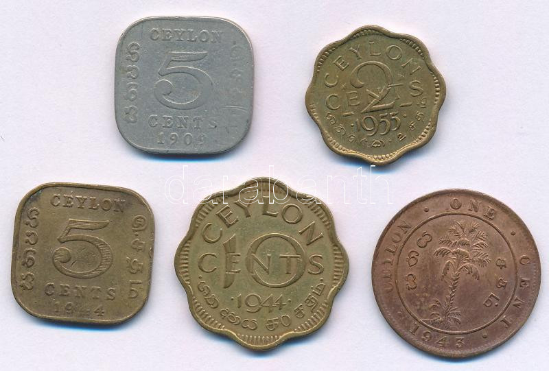 Ceylon 1909. 5c Cu-Ni "VII. Eduárd" + 1943. 1c bronz "VI. György" + 1944. 5c-10c Ni-sárgaréz (2xklf) "VI. György" + 1955. 2c sárgaréz "II. Erzsébet" TVF,F patina, ph