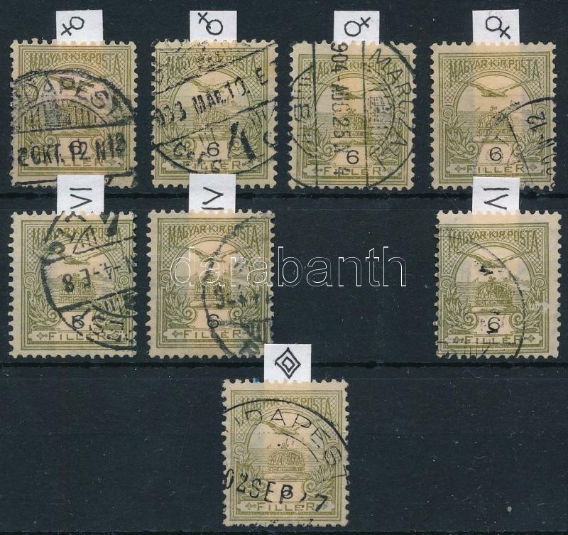 1900 Turul 6f 4 féle vízjellel és 3 féle számvízjellel és csillagidom vízjellel, összesen 8 zöldes olaj bélyeg E fogazással, stecklapon