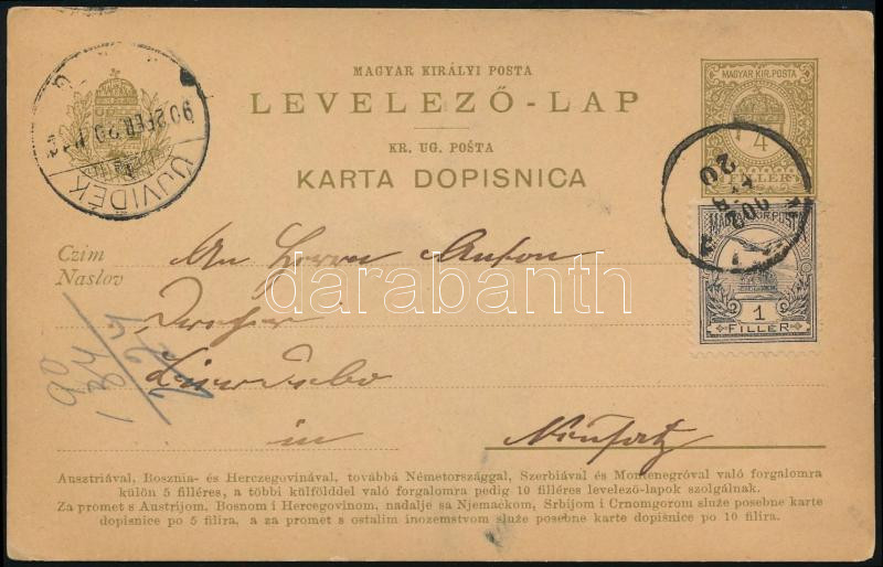 1902 4f díjjegyes levelezőlap Turul 1f díjkiegészítéssel