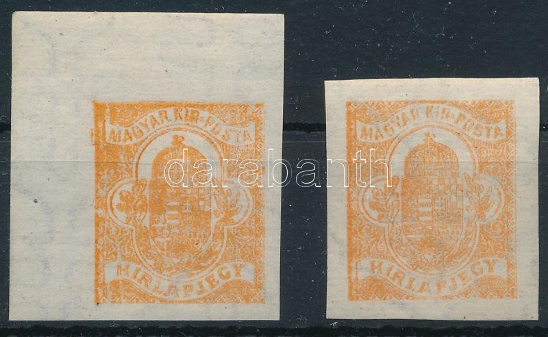 1913 2 db Hírlapbélyeg, az egyik hiányos nyomat, a másikon a felső keretszegély gépszínátnyomatával