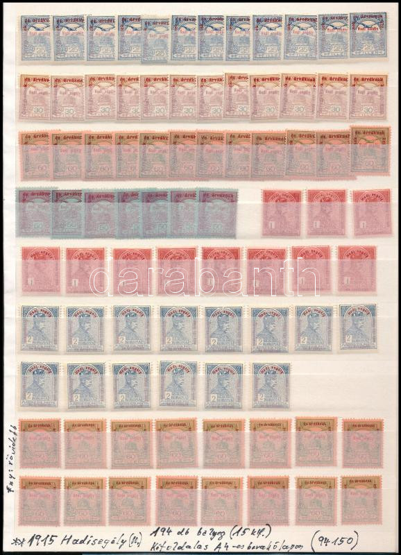 1915 Hadisegély II. 194 db bélyeg (15 klf) A/4-es berakólap mindkét oldalán (94.150)