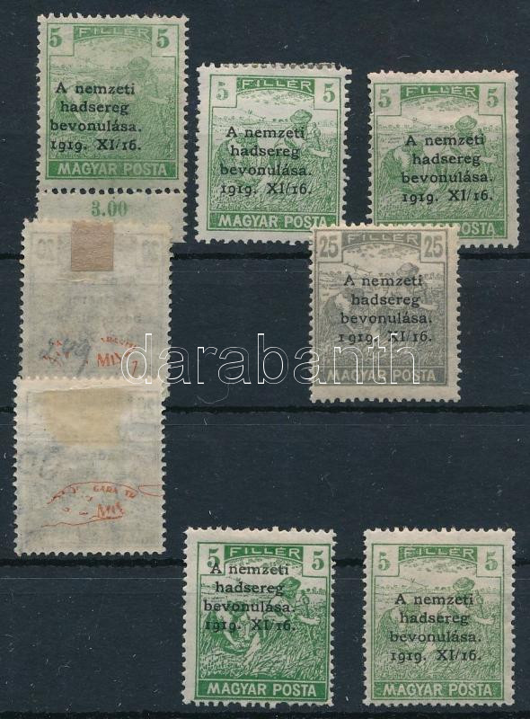 1919 A nemzeti hadsereg bevonulása 8 db bélyeg SOCMIS garanciabélyegzéssel: 5f eltolódott felülnyomattal, hiányos értékszámmal, 20f szétfolyt hátoldali bélyegző, 25f szürke színben