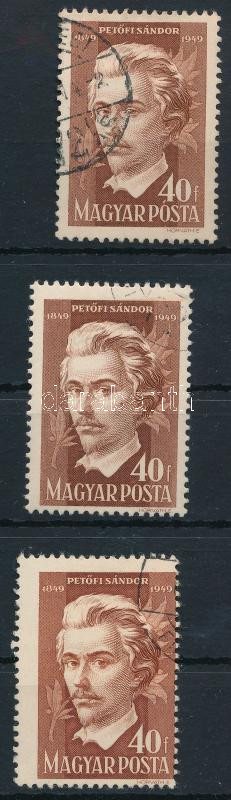 1949 3 x Petőfi 40f lemezhibákkal (ékezet a "O" betűn, barna pötty az arcon) és elfogazott bélyeg
