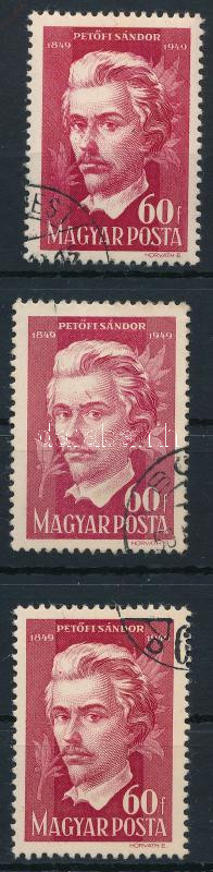 1949 3 x Petőfi 60f bélyeg lemezhibákkal (csíkok az orrán, homlokán, pötty a haján)
