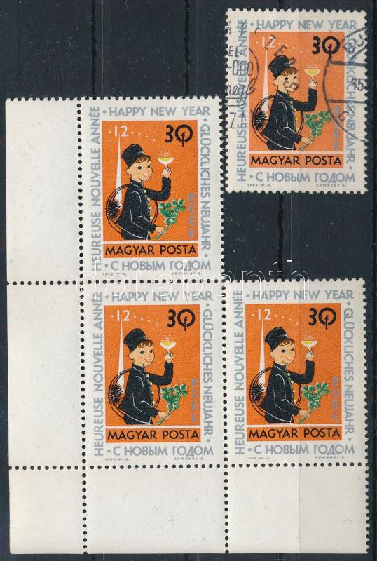 1963 Újév (I.) 30f 3-as ívsarki összefüggés a sárga szín felfelé tolódott (gombok, pezsgő), a haj is felcsúszott + támpéldány (60.000)