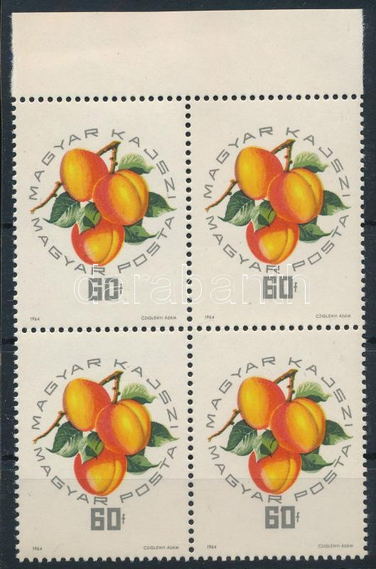 1964 Magyar barackfajták 60f ívszéli négyestömb, folt az értékszámon a 4. bélyegen