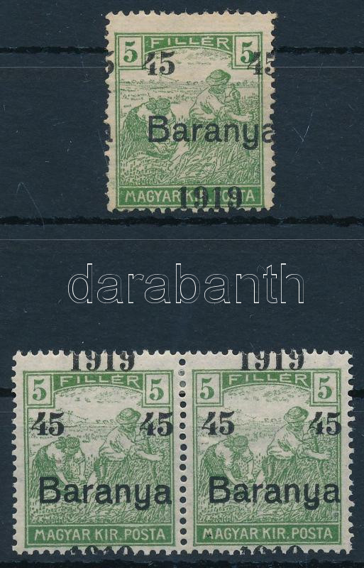 Baranya I. 1919 3 db bélyeg elcsúszott felülnyomással, Bodor vizsgálójellel