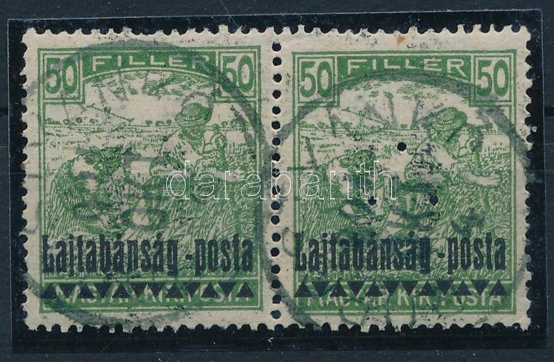 Nyugat-Magyarország (III.) 1921 Arató 50f vízszintes pár, a jobb oldali bélyeg hármaslyukasztással, Bodor vizsgálójellel
