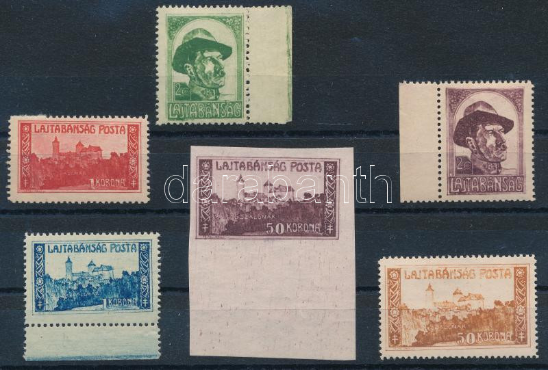Nyugat-Magyarország (VII.) 1921 6 db bélyeg: 20f, 1K, 50K eredeti színekben és próbanyomatokban Bodor vizsgálójellel