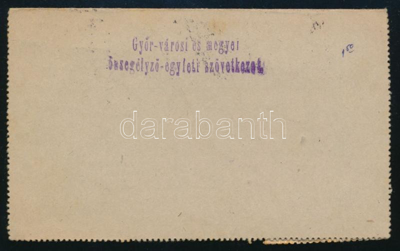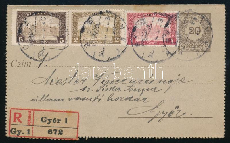 1922 Győr helyi ajánlott díjjegyes zárt levelezőlap 3 bélyeggel kiegészítve