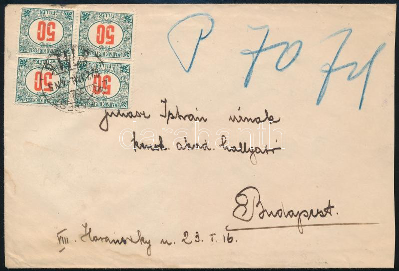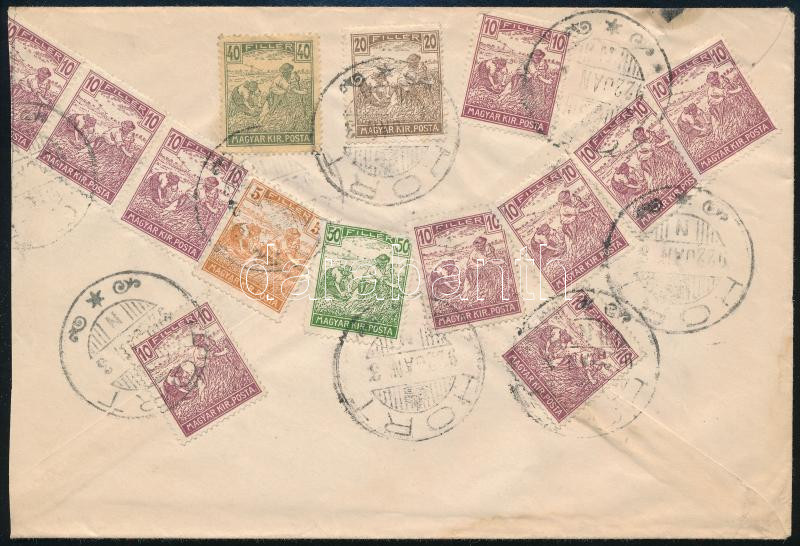 1922 Levél 14 db bélyeggel (1 sérült) Hortról Budapestre küldve, ott 4 db portó 50f bélyeggel kiegészítve (hármaslyukasztásúak)