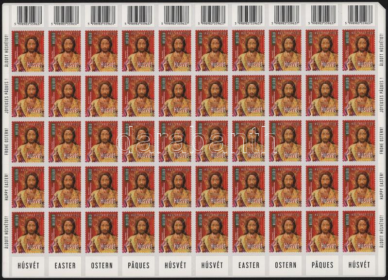 2021 Húsvét - Belföld öntapadós hajtott teljes ív, ívszélen vonalkóddal, "HÚSVÉT" és "ÁLDOTT HÚSVÉTOT" több nyelvű felirattal (14.500)