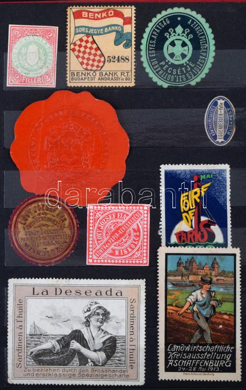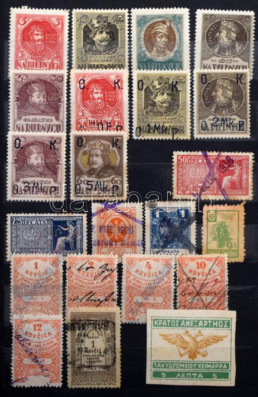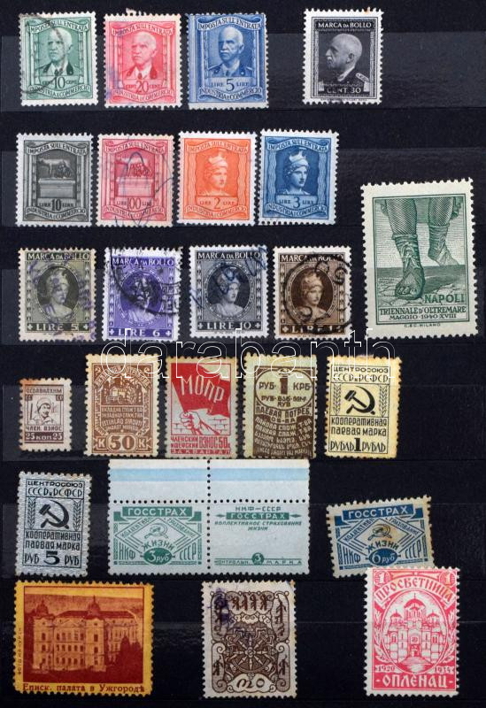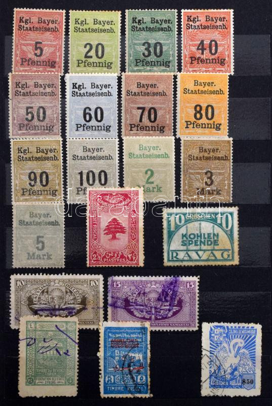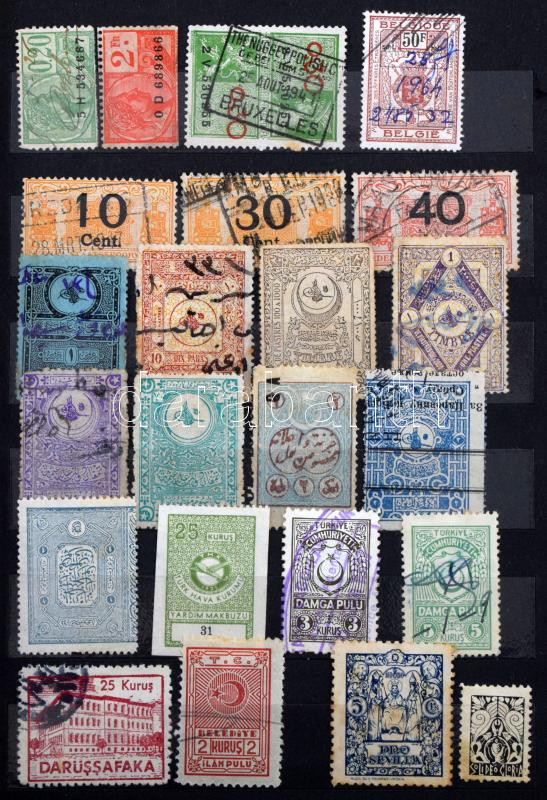 ~170 db régi külföldi okmánybélyeg, parafilatélia, stb. + kb 150 régi postabélyeg, 12 lapos közepes Philux berakóban