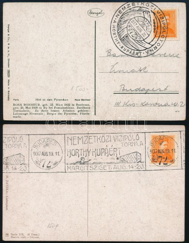 1937.08.19-20. 2 db képeslap - egyik címzetlen - "NEMZETKÖZI VÍZIPÓLÓ TORNA A HORTHY KUPÁÉRT" kétféle alkalmi bélyegzéssel