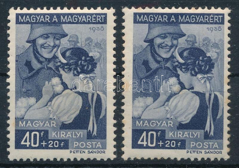 1939 Magyar a magyarért 40f alul a MAGYAR szó "GY" betűjében lemezhiba + támpéldány (rozsdapötty / stain spot)