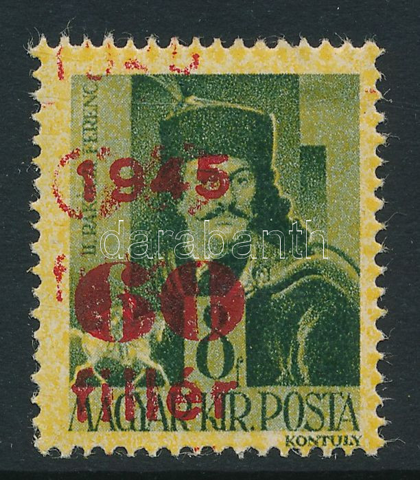 1945 Kisegítő 60f/8f kettős piros felülnyomással (hátoldalán sérült papír, betapadás / damaged back, gum disturbance)
