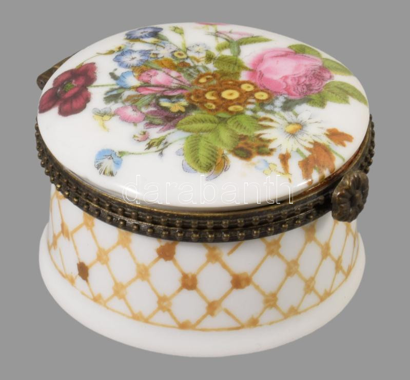 Limoges rózsamintás ékszertartó szelence, jelzett, hibátlan, d: 5,5 cm