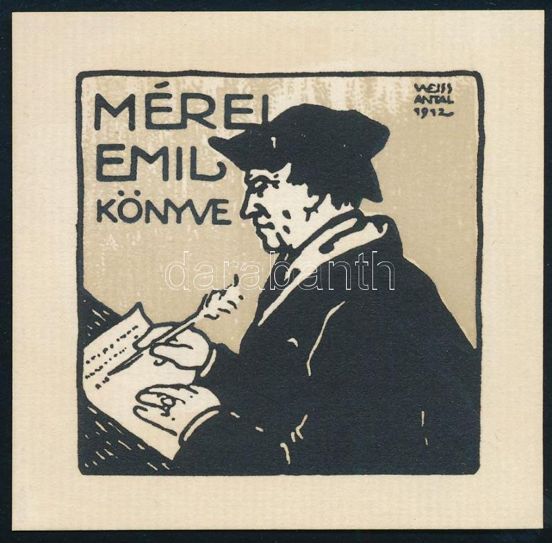 Weiss Antal (1886-1963): Mérei Emil könyve, 1912 (feltehetően Luther Márton ábrázolással). Klisényomat, papír, jelzett a klisén, 3,5×3,5 cm