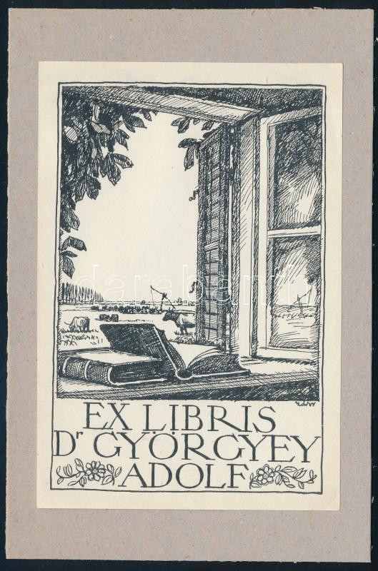 Zádor István (1882-1963): Ex libris Dr Györgyey Adolf. Klisényomat, papír, jelzett a nyomaton, lap teteje kartonra kasírozva, 10×6,5 cm