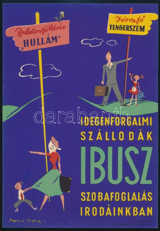 Toncz Tibor (1905-1979): Idegenforgalmi szállodák IBUSZ szobafoglalás irodáinkban, 1952 körül. Villamosplakát, papír, jelzett a plakáton, Offset Nyomda, jó állapotban, 24×16,5 cm