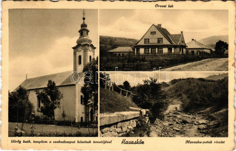 1940 Havasköz, Görög katolikus templom a szabadcsapat hőseinek temetőjével, Orvosi lak, Havaska patak / Greek Catholic church, cemetery, Medical house, creek (EK)