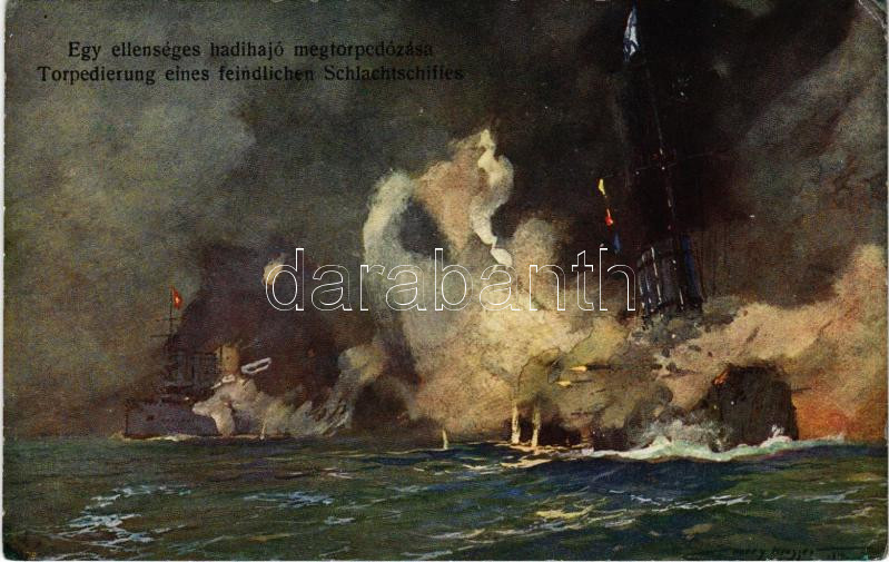 Egy ellenséges hadihajó megtorpedózása / Torpedierung eines feindlichen Schlachtschiffes. K.u.K. Kriegsmarine / WWI Austro-Hungarian Navy, sinking an enemy battleship s: Harry Heusser (r)