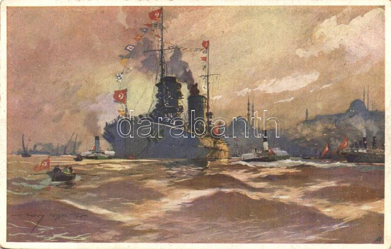Flaggengala im Hafen von Konstantinopel. K.u.K. Kriegsmarine. Offizielle Postkarte des Österreichischen Flottenvereines zu Gunsten der Kriegsfürsorgeamtes, Kriegshilfsbüros und des Rotes Kreuzes / WWI Battleship dressed overall with international maritime signal flags in the port of Constantinople (Istanbul). s: Harry Heusser