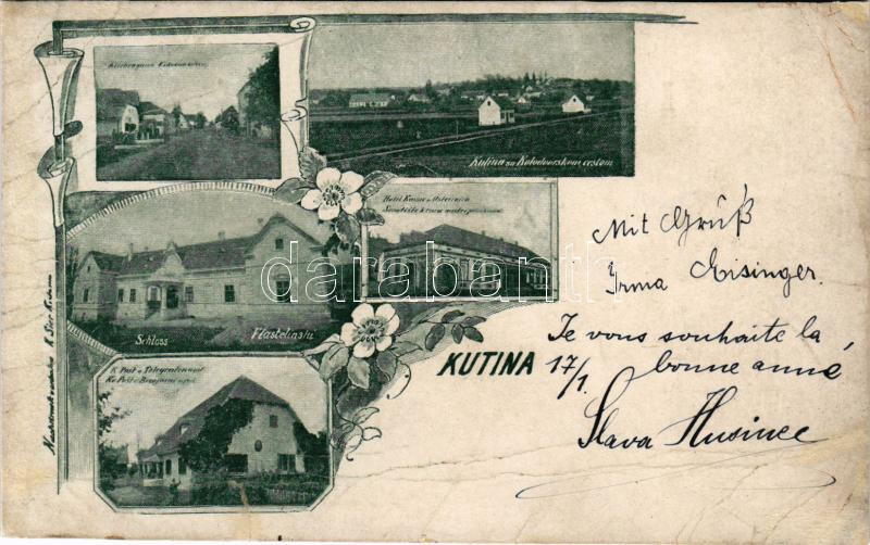 1899 Kutina, Kirchengasse, Schloss, Hotel Kaiser, Post und Telegrafenamt / utca, kastély, posta és távirda hivatal, vasútállomás, szálloda / street, castle, post office, railway station, hotel. Art Nouveau, floral (r)