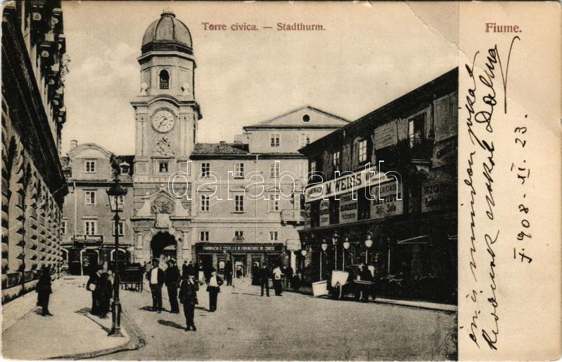 1908 Fiume, Rijeka; Stadthurm / Torre civica / városháza, torony, M. Weiss üzlete, gyógyszertár / tower, shops, pharmacy (EB)