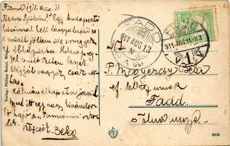 1911 Fiume, Rijeka; kikötő. Philipp Rubel kiadása. A képeslap címzettje P. Megyercsy Béla (1879-1916) református lelkész, a hazai cserkészet egyik megalapítója, katonaotthonok szervezője. / port (EB)