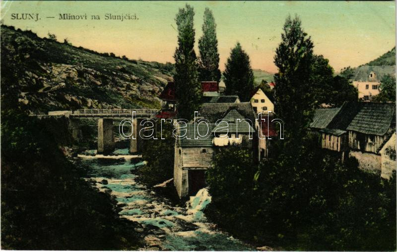 1912 Szluin, Sluin, Slunj; vodeni mlin / vízimalom, híd, folyó. B. W. Wien IX./I. ges. geschützt 1911.-602 / water mill, bridge, river (EK)