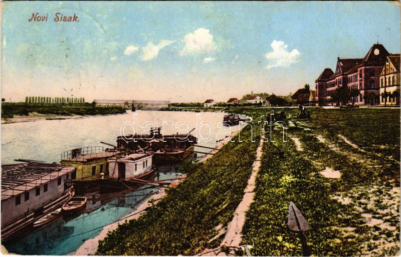 1915 Újsziszek, Novi Sisak (Sziszek, Sisak); látkép, híd, kikötő. Janko Dujak kiadása / general view, bridge, port, ships (EK)