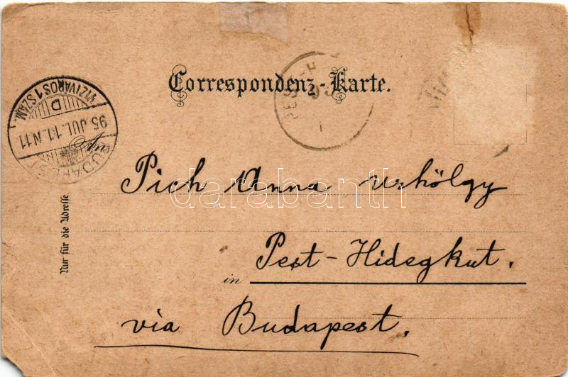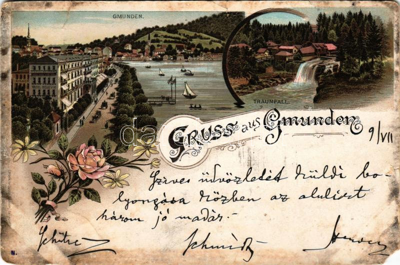 Gmunden (Salzkammergut), Traunfall, Hotel Bellevue. Druck von Louis Glaser / waterfall, view, hotel. Art Nouveau, floral, litho (b)