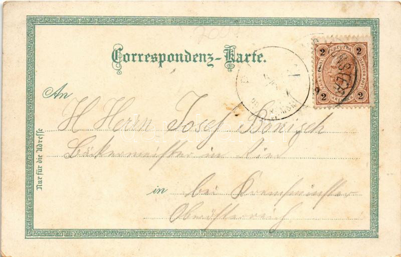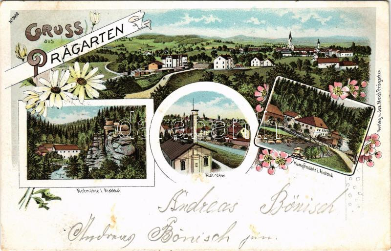 Prägarten, Pregarten; Notmühle im Aistthal, Aist-Ufer, Kumpfmühle. Jos. Meisl / mills, view, bridge. Art Nouveau, floral, litho (EM)