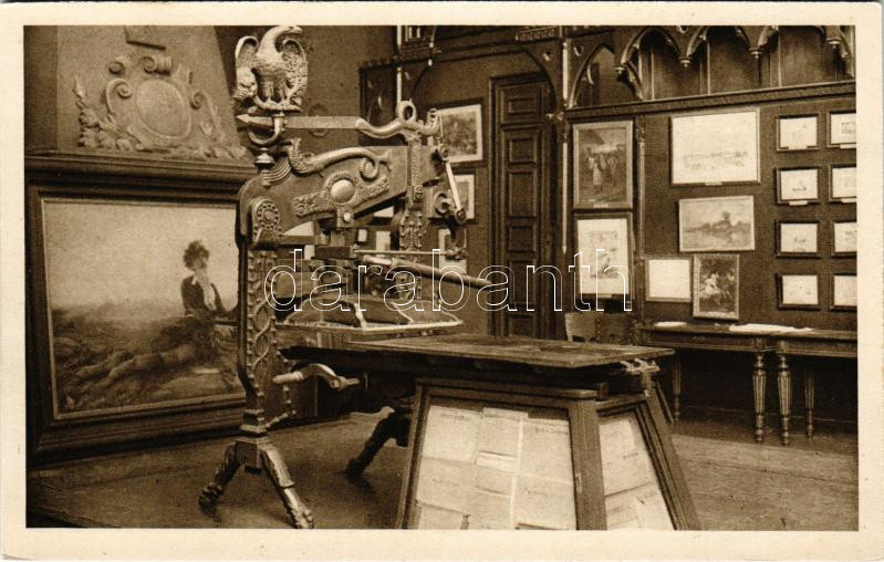 Petőfi-centenárium emlékére (1823-1923). A Landerer és Heckenast-féle sajtógép 1848-ból, amelyen a Nemzeti dalt nyomták. A sajtógép a Petőfi házban áll, mögötte Madarász Viktor 1875-ben készült képe, a "Petőfi halála". Rigler kiadása 316. sz.