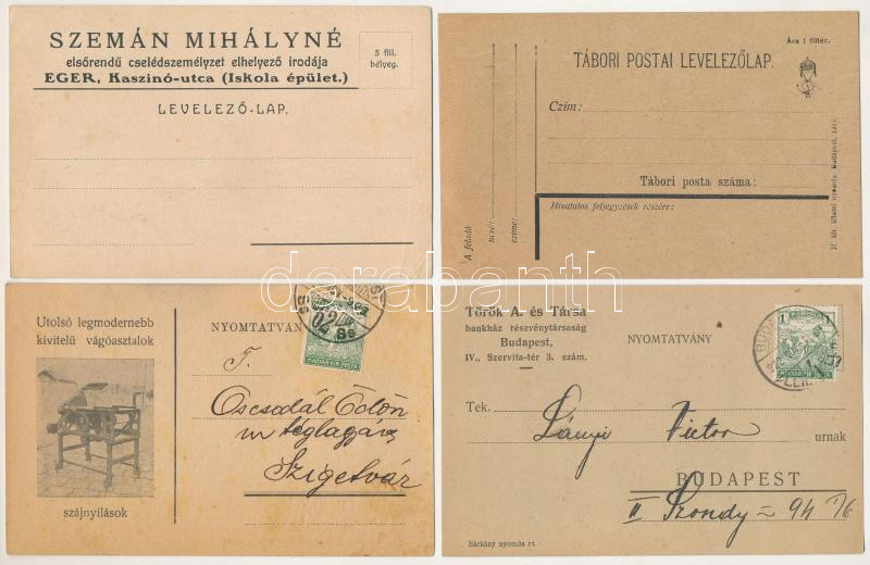 10 db RÉGI levelezőlap közte pár reklám és 1 használatlan első világháborús tábori postai levelezőlap / 10 pre-1945 correspondence cards including some advertising cards and 1 unused WWI K.u.K. military field postcard (Feldpostkarte)