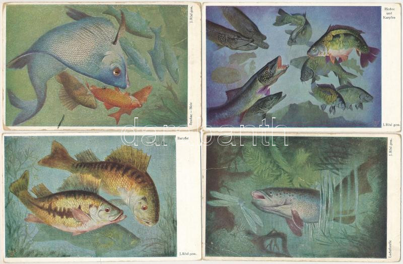 4 db RÉGI német motívum képeslap: halak. Wohlgemuth & Lissner / 4 pre-1945 German fish art postcards